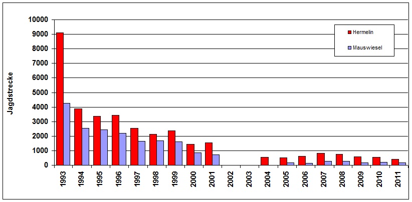 Tatsächlich sind jedoch die realen Populationsentwicklungen aus der Jagdstrecke nicht abzuleiten, da die Fangintensität sich aus den oben genannten Gründen in unbekanntem Ausmaß reduziert hat. Ob sich ein Rückgang von Mauswiesel und Hermelin tatsächlich vollzogen hat, ggf. in welchem Umfang oder aufgrund welcher Landschaftsveränderungen lässt sich nach den Streckenergebnissen nicht beantworten.