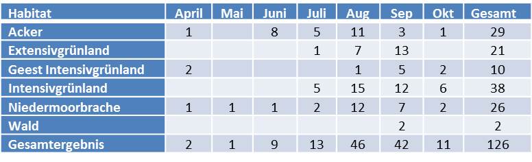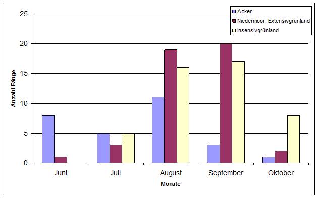 Die Zeitabfolge der Fänge variiert jedoch in den einzelnen Habitaten. Während sich im Ackerland bzw. dessen Randbereichen die häufigsten Fangresultate in den Monaten Juni bis einschließlich August ergaben, wurden höhere Fangzahlen in Grünland- und Brachestandorten erst ab August bis in den Oktober hinein dokumentiert.