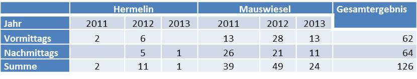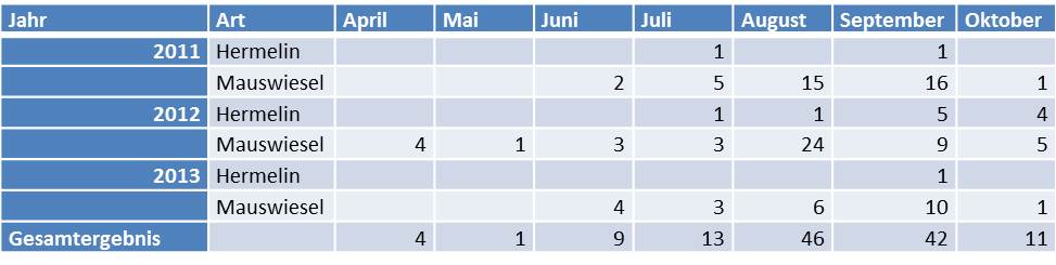 Während der drei Untersuchungsjahre konnten insgesamt 112 Mauswiesel und 14 Hermeline gefangen werden. Im November blieben Fangergebnisse in allen Jahren aus.