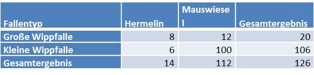Nach diesen Ergebnissen ist das Mauswiesel deutlich häufiger als das Hermelin, was jedoch teilweise durch den Einsatz von überwiegend kleinen Wippbrettfallen begründet sein kann. Bei nur fünf eingesetzten großen Wippfallen in den Jahren 2012 und 2013 wurden acht Hermeline in diesen gefangen, während über alle drei Untersuchungsjahre in kleinen Wippfallen nur sechs Fänge des Hermelin dokumentiert werden konnten. Da die kleinen Fallen bereits bei sehr geringen Tiergewichten auslösen, sind dadurch sehr häufig Mäuse in den Fallen, die dadurch blockiert sind. Nach den im vorliegenden Bericht erlangten Ergebnissen sind demnach Wippfallen ohne Gewichte an den Wippbrettern nicht geeignet, um das Hermelin effizient nachzuweisen. Die Größe der Falle in Verbindung mit einem höheren Auslösegewicht bringt wesentlich höhere Fangergebnisse für das Große Wiesel.