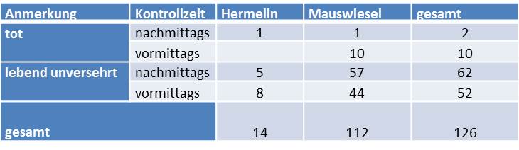 Der Fang der beiden Mustela-Arten ist dennoch nicht unproblematisch, da vielfach von höheren Mortalitätsraten durch den Einsatz von Wippbrettfallen berichtet wird. Die Mortalitätsrate der gefangenen Individuen in der vorliegenden Untersuchung liegt beim Mauswiesel bei insgesamt 112 gefangenen Individuen bei 9,8 Prozent und beim Hermelin bei 7,1 Prozent (nges = 14, davon ntot = 1). Die Daten zum Hermelin wären in weiteren Untersuchungen durch eine höhere Stichprobe abzusichern.