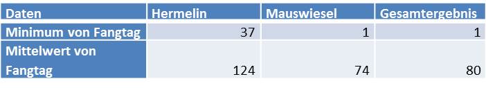Der früheste Tag nach Ausbringung einer Falle ist bei Hermelin und Mauswiesel sehr unterschiedlich. So wurden einzelne Mauswiesel bereits am Tag eins nach Aufstellung gefangen, während der früheste Fang eines Hermelins erst nach 37 Tagen gelingen konnte. Im Mittel wurden Mauswiesel nach 74 Tagen und die hier zu betrachtenden 14 Hermeline erst nach 124 Tagen nach Ausbringung der Fallen gefangen. Diese Mittelwerte sind jedoch kaum aussagefähig, da es einem Automatismus unterliegt, dass die Zahl der Fangtage mit fortschreitender Jahreszeit ansteigt.