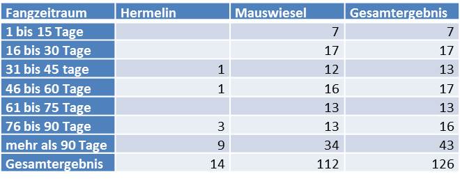 Die hohe Zahl an Fängen nach mehr als 90 Tagen ergibt sich aus der jahreszeitlich frühen Aufstellung vieler Fallen bereits im April oder Mai. In Anbetracht der Tatsache, dass Mauswiesel schwerpunktmäßig in den Monaten August und September und Hermeline tendenziell frühesten ab August bis in den Oktober gefangen werden, resultiert zwangsläufig eine Zahl, gerechnet ab dem Aufstelldatum der Falle, die drei Monate und mehr beträgt.