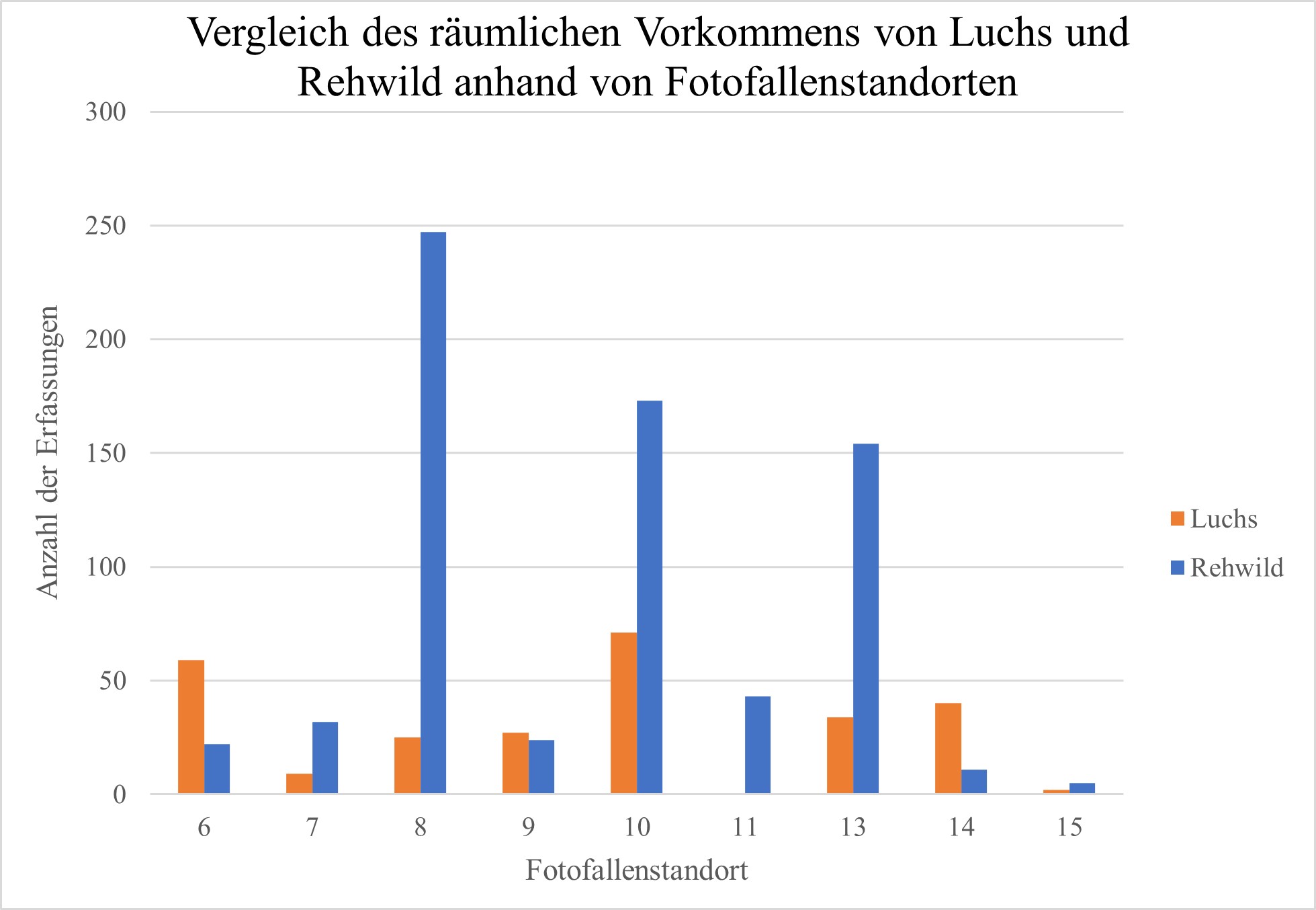 Die Fotodokumentation erbrachte über 1.100 Aufnahmen von Rehen, womit Rehe ähnlich häufig von Wildkameras erfasst wurden wie Luchse. Das Rehwild zeigt jedoch ein ausgesprochenes Sicherungsverhalten auf den Fotos. Sichern und nervöses Verhalten, ständiges Abspringen sind Verhaltensformen, die auf den Bildern überwiegend zu sehen sind. Kurze Äsungsintervalle und intensives Sichern sind Teil der Anpassungsstrategie des Rehwildes. In Zeiten höchster Luchsaktivität, so z.B. während der Ranz im Februar sind Rehe kaum auf den Wildkameras zu sehen und erst im Frühling werden sie aktiver, wenn der Luchs geringere Aktivität zeigt. Selbst die Blattzeit liegt in einer Zeit, in der Luchs eher selten auf den Kameras auftauchen.
