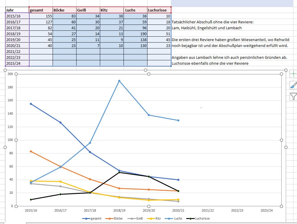 Ursächlich für den aktuell geringen Anteil an Rehbockbeobachtungen kann das Zusammenwirken von Luchs und Jäger sein. Unter der Annahme, dass der Luchs nicht zwischen den Geschlechtern selektiert, die Jäger im Chamer Winkel allerdings weibliches Wild und Kitze in geringerem Umfang jagen, da die Wilddichte zurückgeht, hingegen die Abschusspläne bei den Böcken teils noch übererfüllen, kann in der Summe „Luchs und Jäger“ eine Überentnahme des männlichen Wildes zu dem verschobenen Geschlechterverhältnis führen.