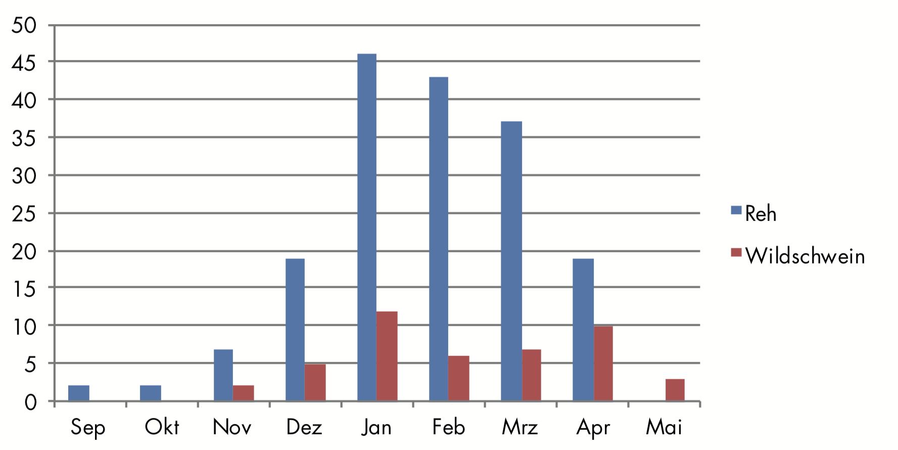 Der Zeitpunkt des Verbisses wurde im Rahmen der Auswertungen zunächst auf Ebene der Monate ausgewertet. Hier wird bereits deutlich, dass der Verbiss im Wesentlichen ab Januar beginnt und bis in die Spätwintermonate anhält. Eine detailliertere Auswertung erfolgt zunächst aufgrund der Stichprobengröße nur für das Reh- und Schwarzwild (siehe Abbildung 3). Bei näherer Betrachtung scheint eine Differenzierung des Verbisszeitpunktes nach Monaten jedoch nicht ausreichend präzise. Werden die Ergebnisse nach Dekaden zusammengefasst, erfolgt mehr als 50 Prozent des gesamten beobachteten Terminaltriebverbisses zwischen dem 20. Januar und dem 10. Februar bis spätestens dem 15. Februar. Die Ursachen für diese Konzentration des Wildverbisses insbesondere durch Rehwild können derzeit nicht beantwortet werden. Es konnte bisher jedoch ausgeschlossen werden, dass der erhöhte Verbiss in diesem engen Zeitfenster aufgrund besonderer Wetterlagen wie ungewöhnlich hohe Schneelage hervorgerufen wurde.