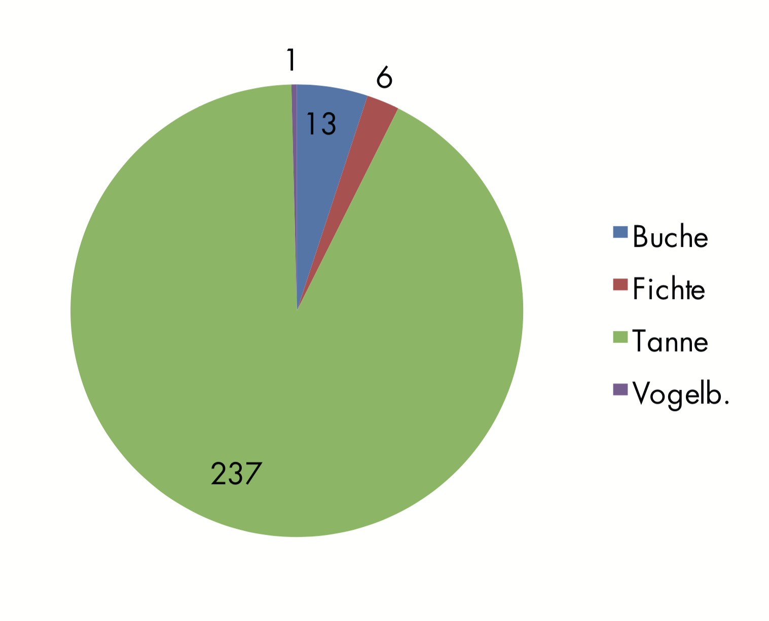 Verbissene Baumarten: Die Grafik zeigt, welche Baumarten in welchem Umfang verbissen wurden. Mit Abstand am meisten betroffen war die Weißtanne: von 257 untersuchten Proben 237 Mal. In Prozent ausgedrückt: über 92 Prozent des in den drei Untersuchungsgebieten erfolgten Verbisses betrafen allein diese Baumart.